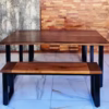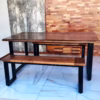 Conjunto Mesa Rústica Caburgua: mesa y dos bancas para terraza, fabricadas en madera de roble nativo y acero negro. Diseño rústico, duradero y perfecto para exteriores. ¡Ideal para tu patio, quincho o terraza!